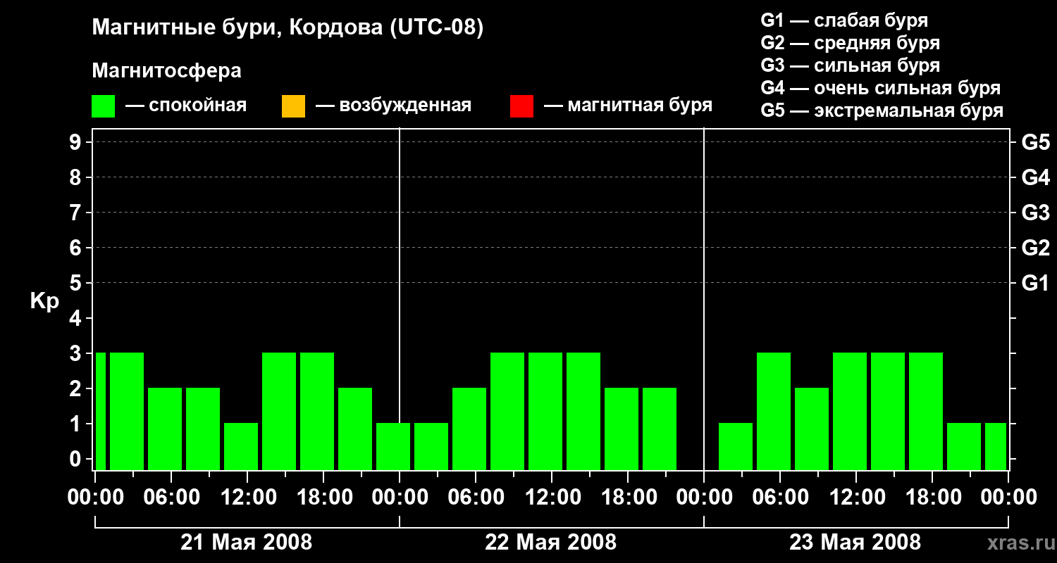 Изменения геомагнитного индекса Kp с 21 по 23 мая 2008 года для средних широт