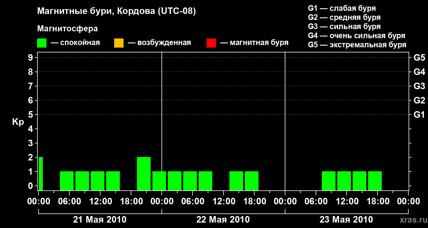 Изменения геомагнитного индекса Kp с 21 по 23 мая 2010 года для средних широт