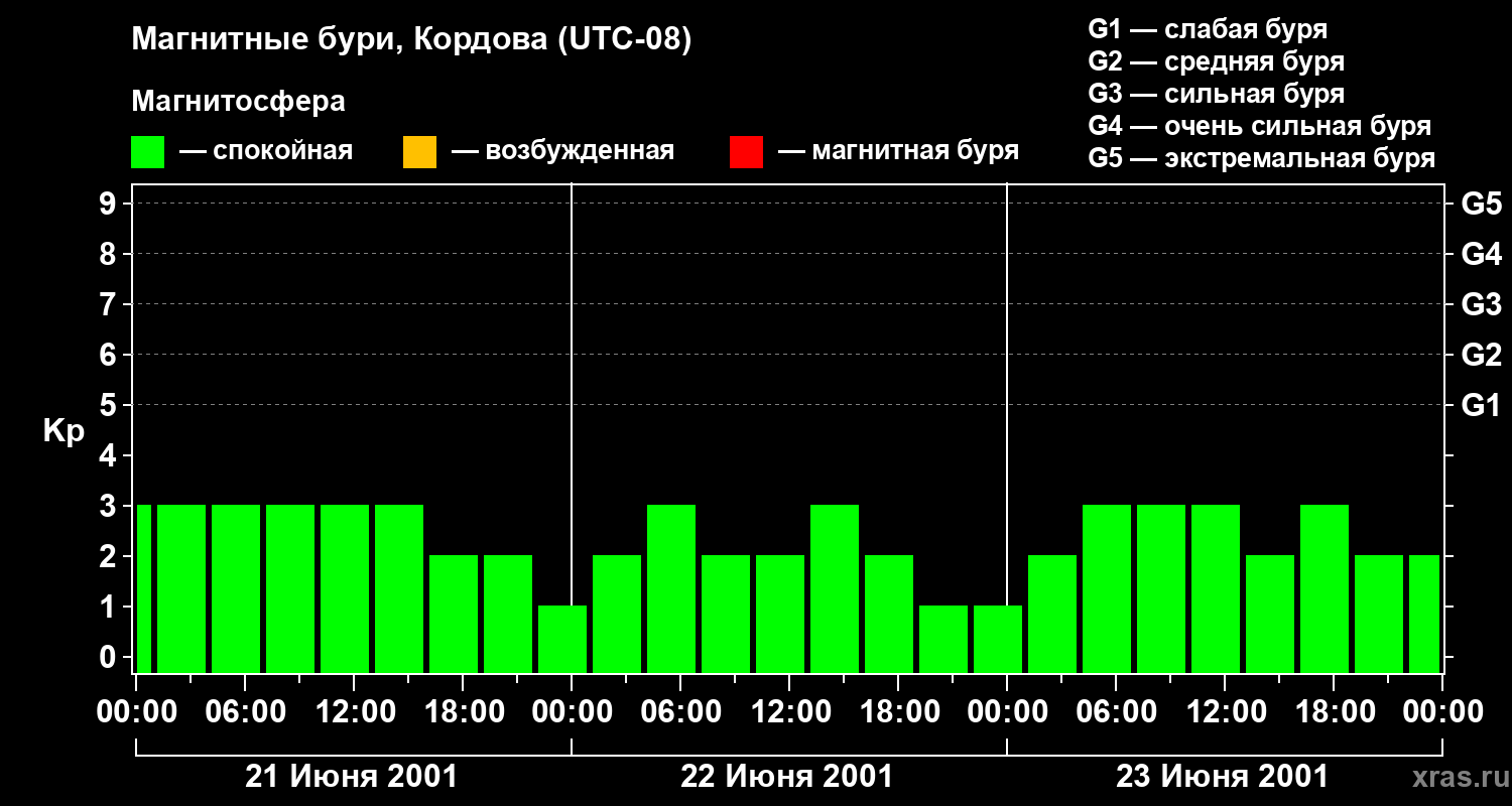 Изменения геомагнитного индекса Kp с 21 по 23 июня 2001 года для средних широт