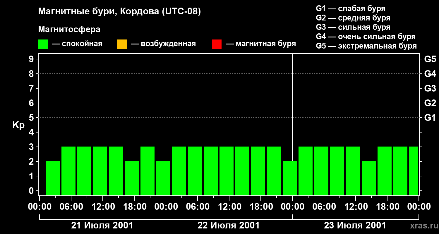 Изменения геомагнитного индекса Kp с 21 по 23 июля 2001 года для средних широт