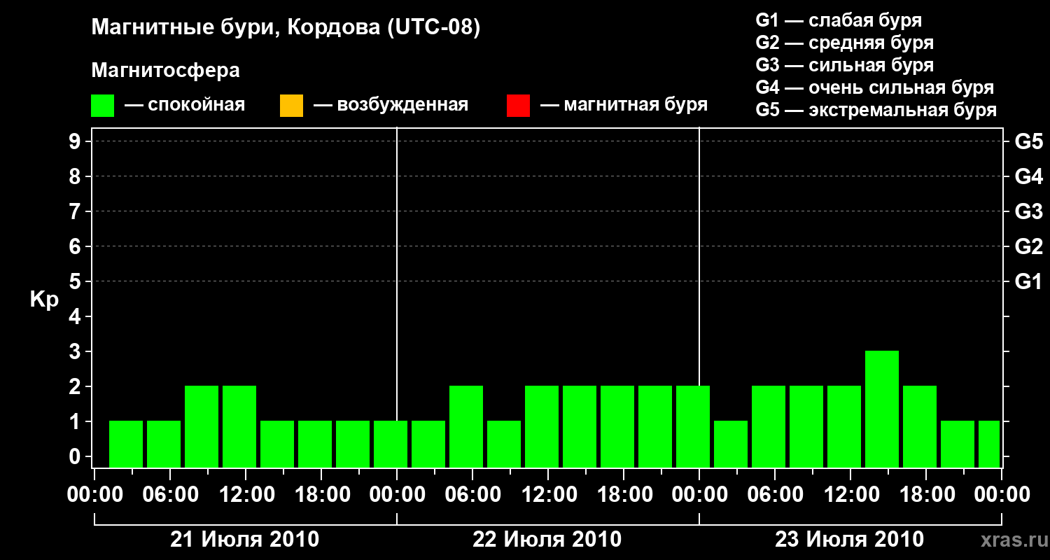 Изменения геомагнитного индекса Kp с 21 по 23 июля 2010 года для средних широт