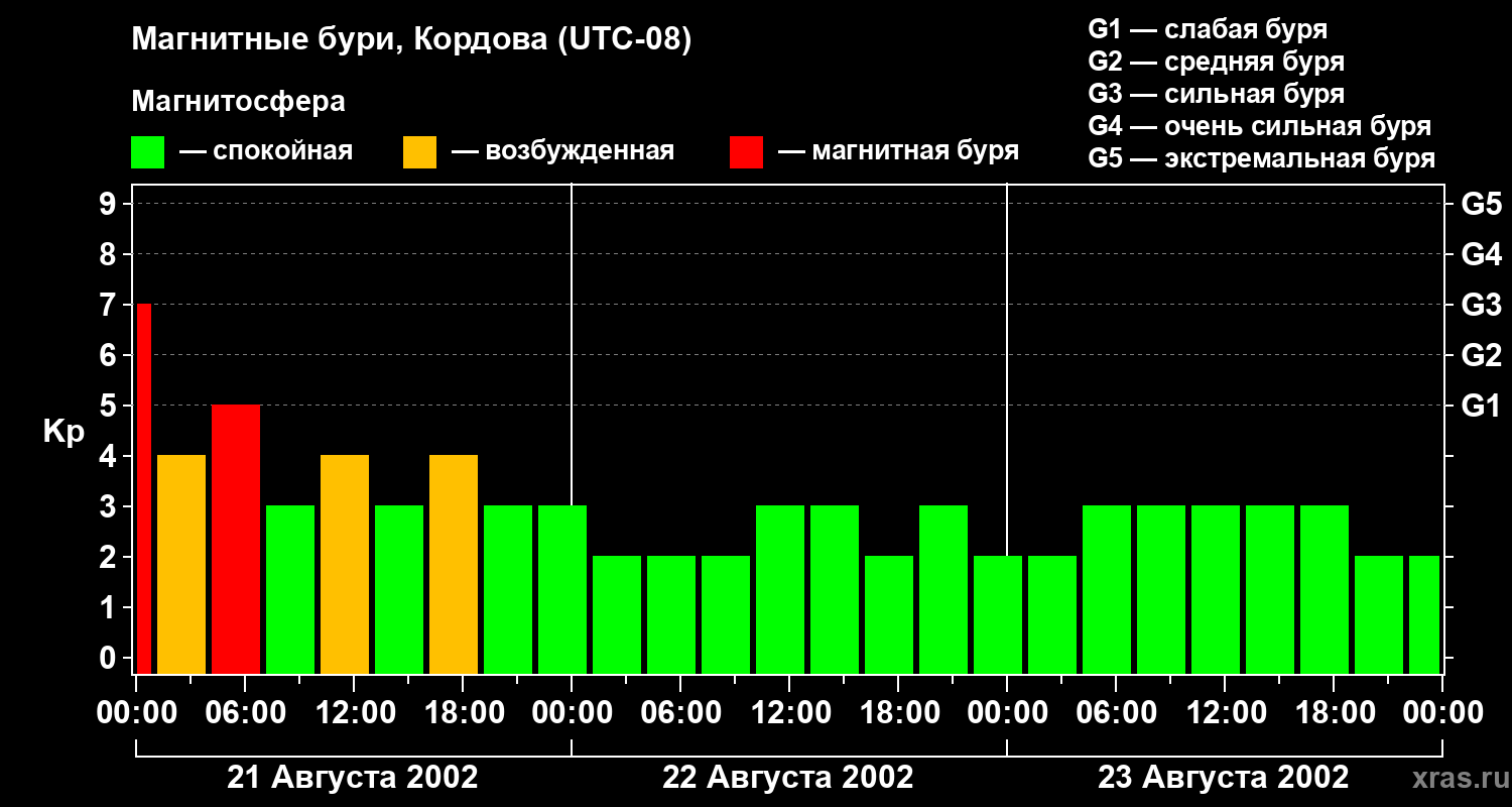 Изменения геомагнитного индекса Kp с 21 по 23 августа 2002 года для средних широт