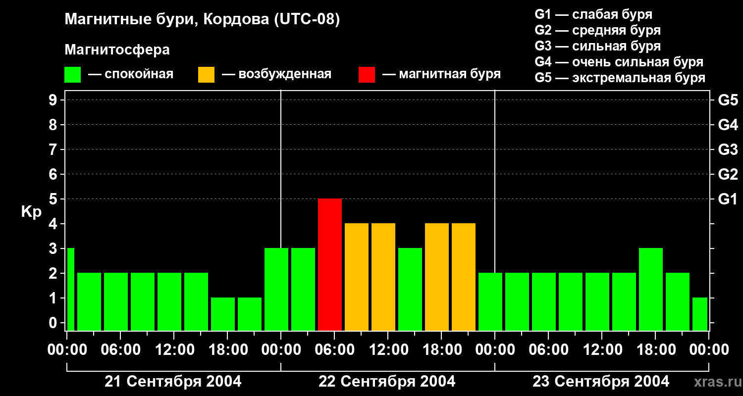 Изменения геомагнитного индекса Kp с 21 по 23 сентября 2004 года для средних широт