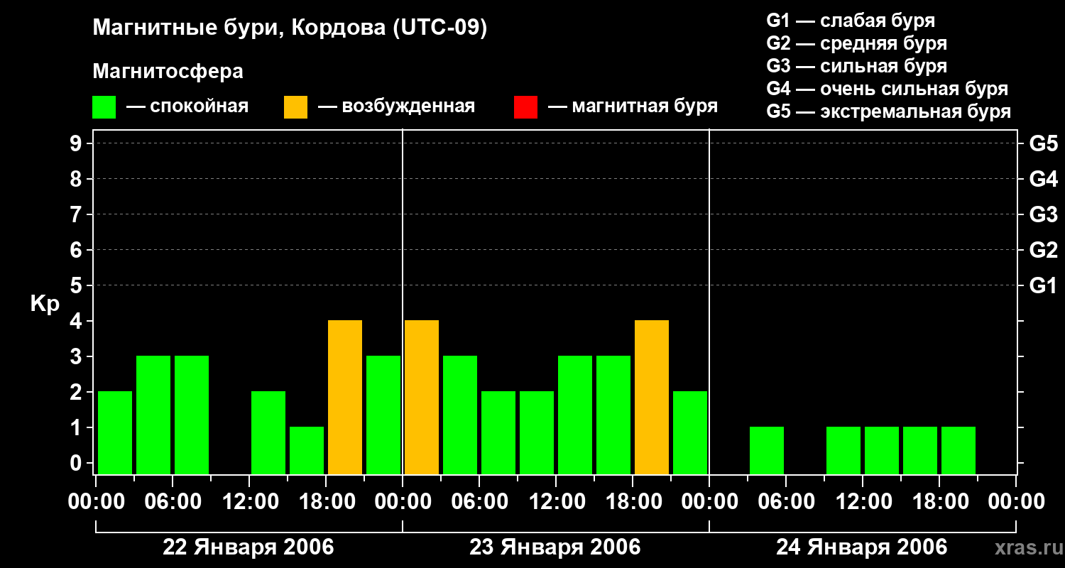 Изменения геомагнитного индекса Kp с 22 по 24 января 2006 года для средних широт