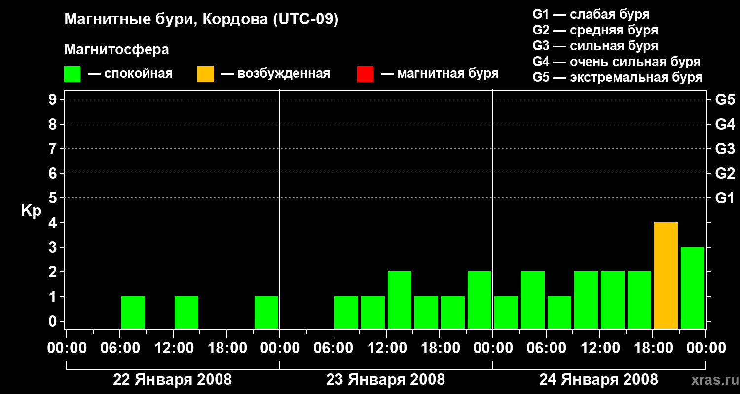 Изменения геомагнитного индекса Kp с 22 по 24 января 2008 года для средних широт