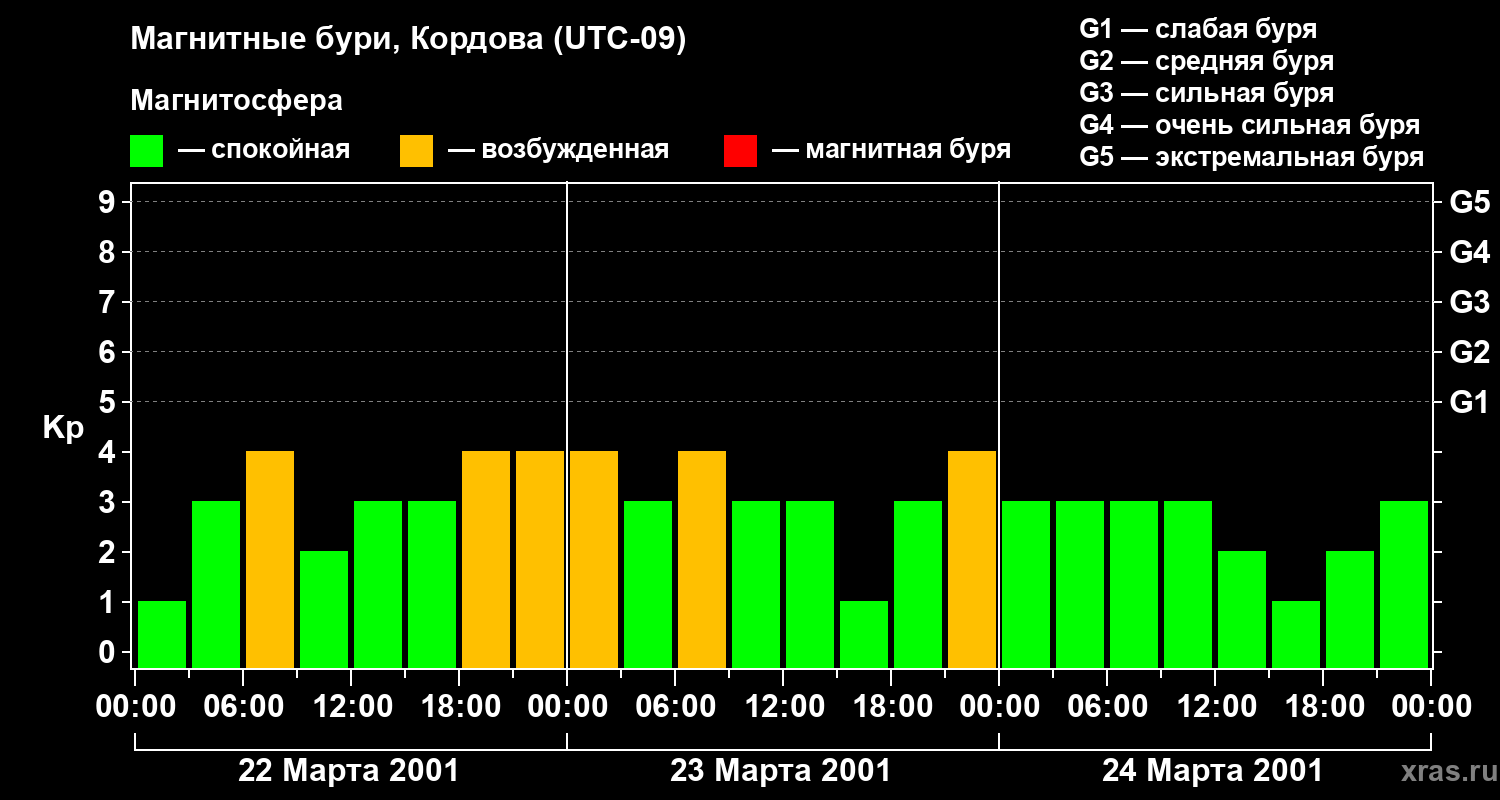 Изменения геомагнитного индекса Kp с 22 по 24 марта 2001 года для средних широт