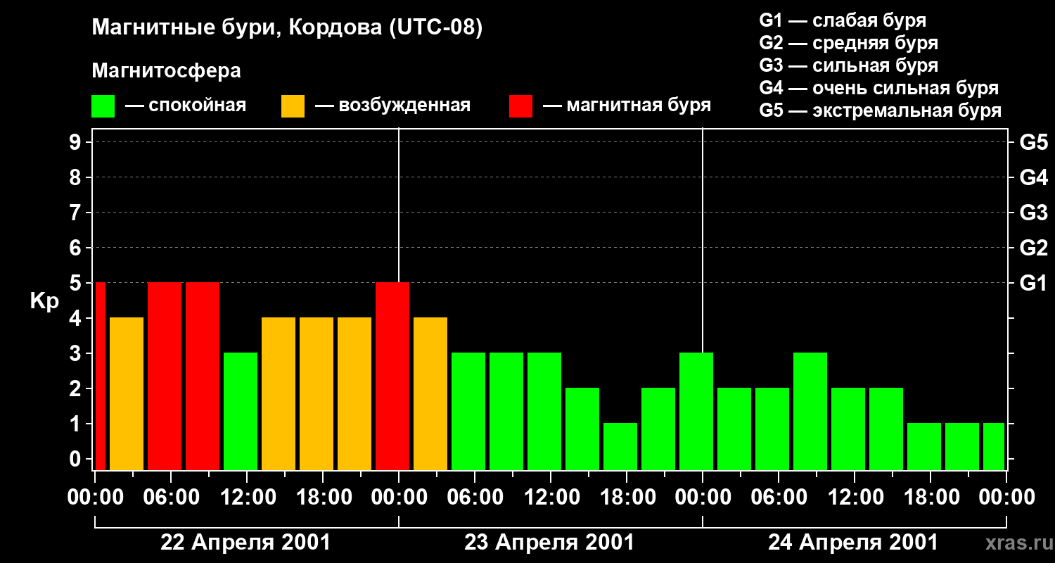 Изменения геомагнитного индекса Kp с 22 по 24 апреля 2001 года для средних широт