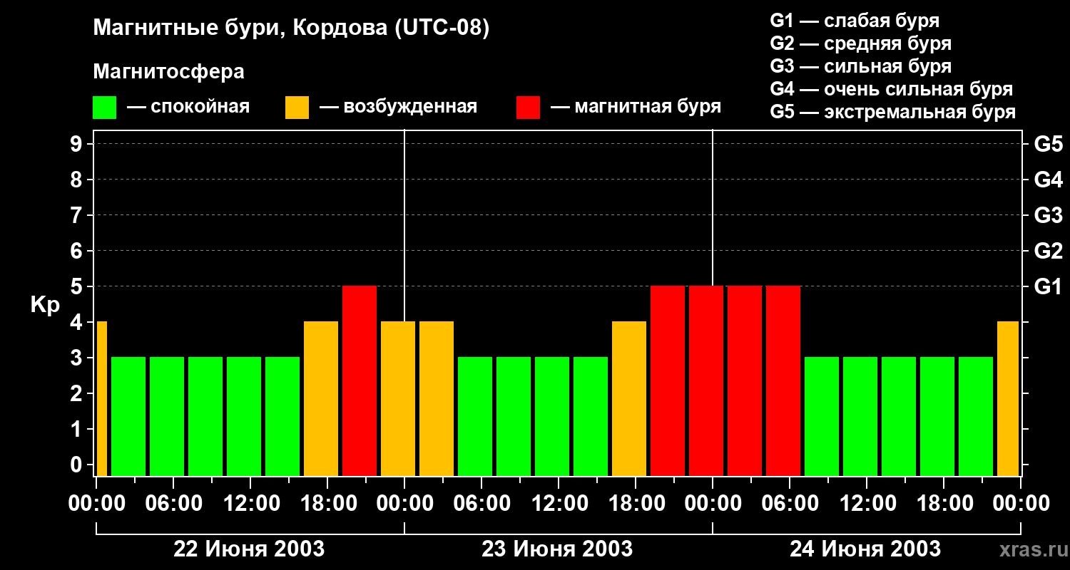 Изменения геомагнитного индекса Kp с 22 по 24 июня 2003 года для средних широт