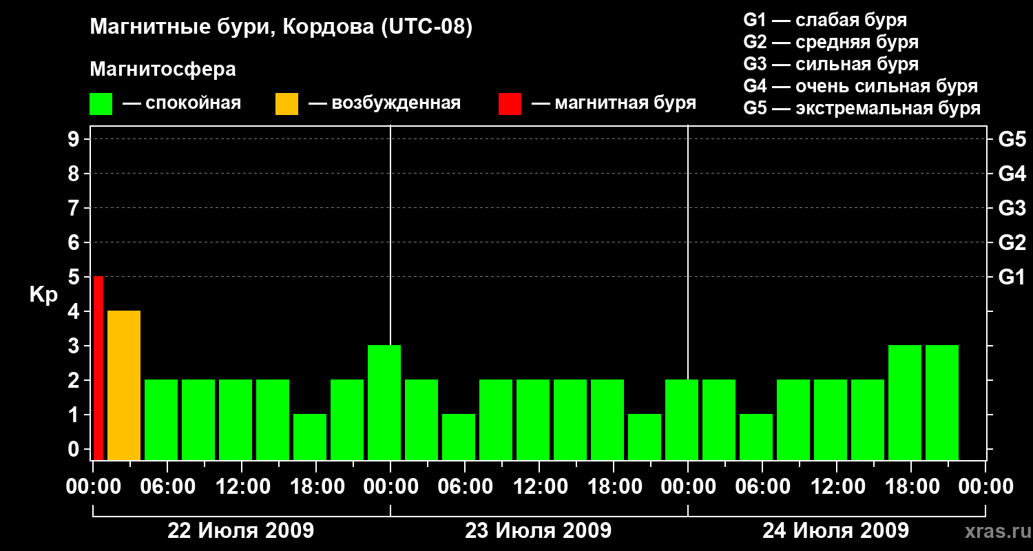 Изменения геомагнитного индекса Kp с 22 по 24 июля 2009 года для средних широт