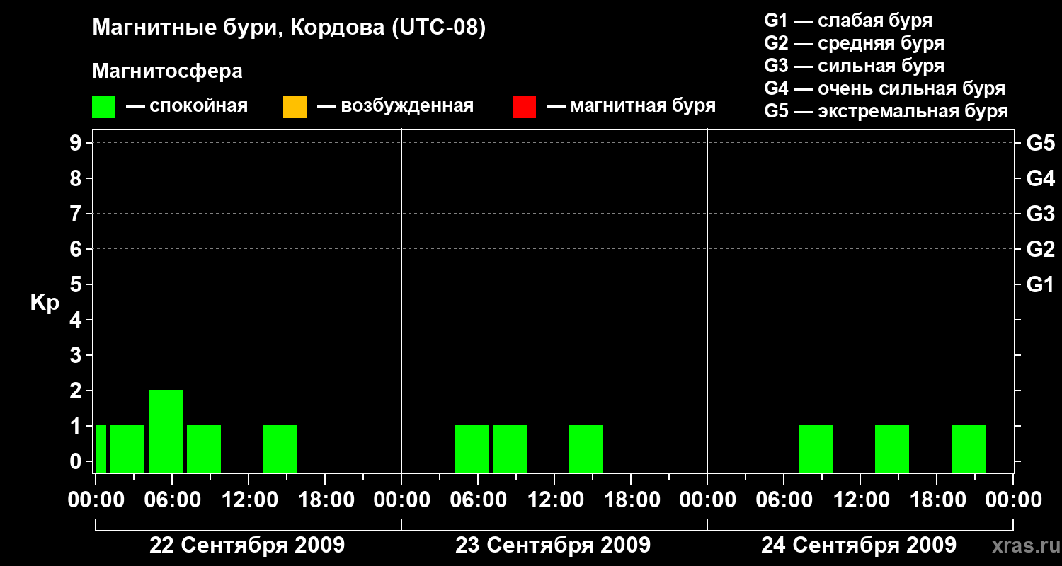 Изменения геомагнитного индекса Kp с 22 по 24 сентября 2009 года для средних широт