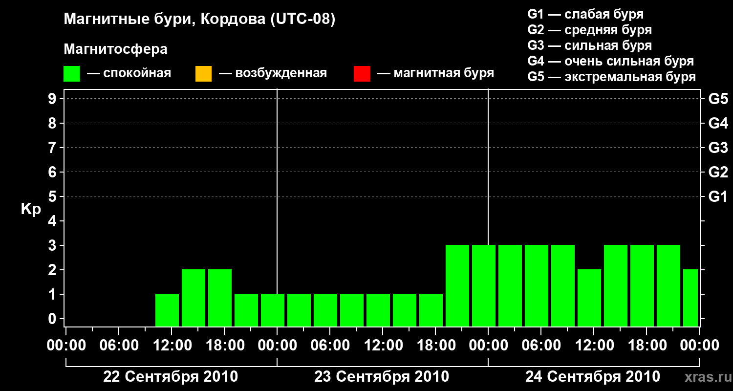 Изменения геомагнитного индекса Kp с 22 по 24 сентября 2010 года для средних широт