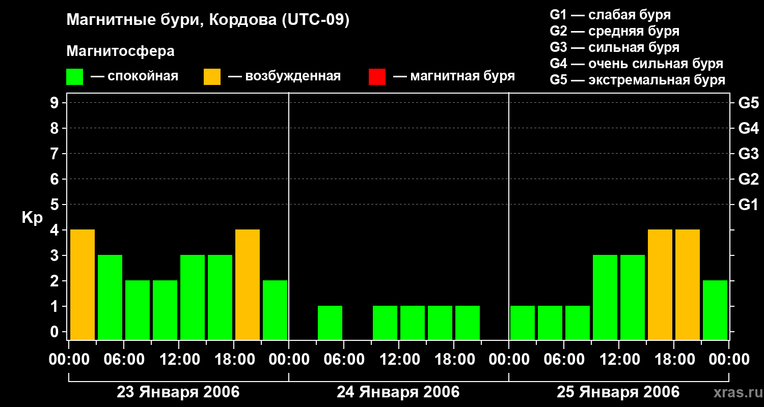 Изменения геомагнитного индекса Kp с 23 по 25 января 2006 года для средних широт