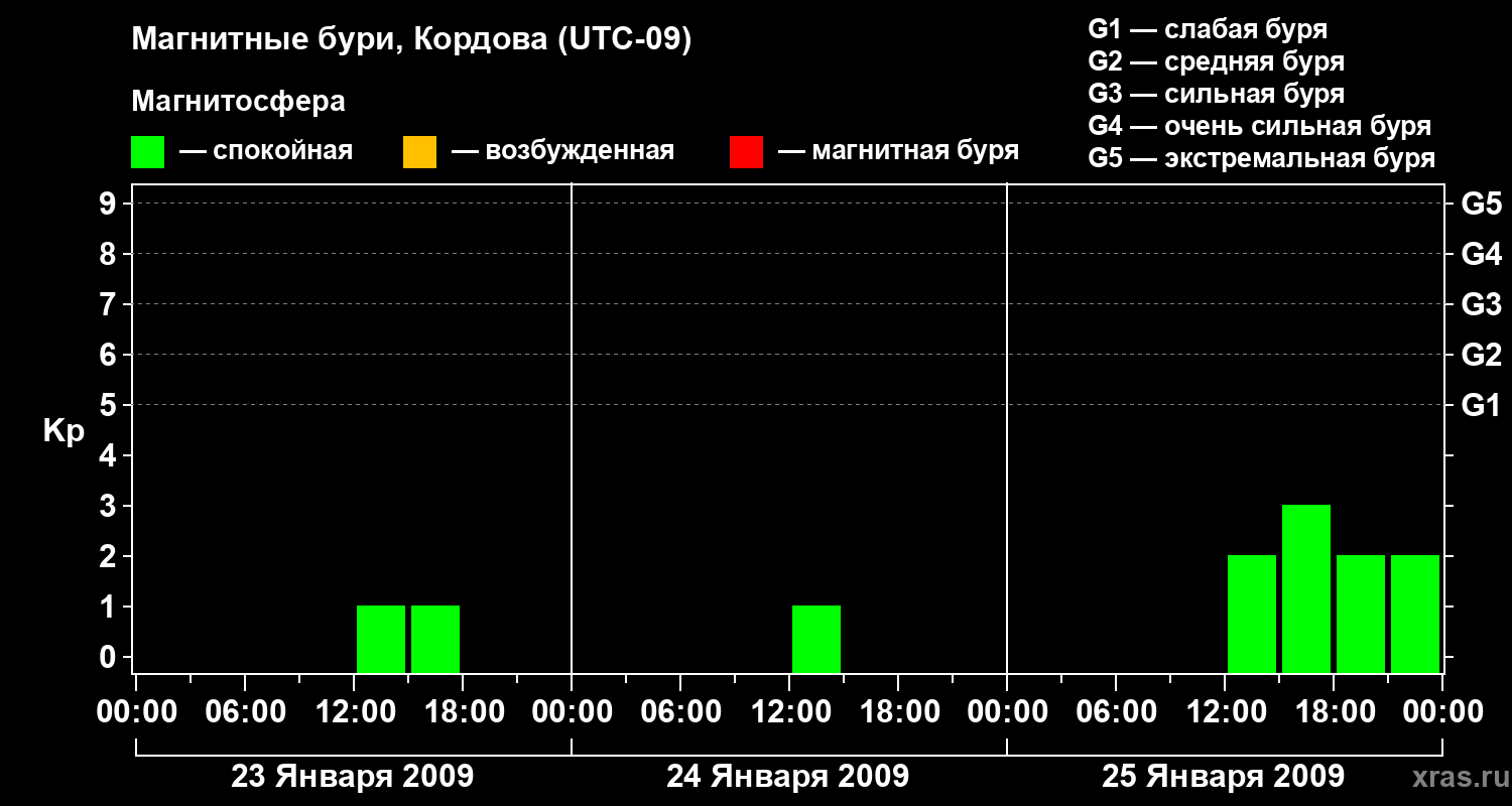 Изменения геомагнитного индекса Kp с 23 по 25 января 2009 года для средних широт