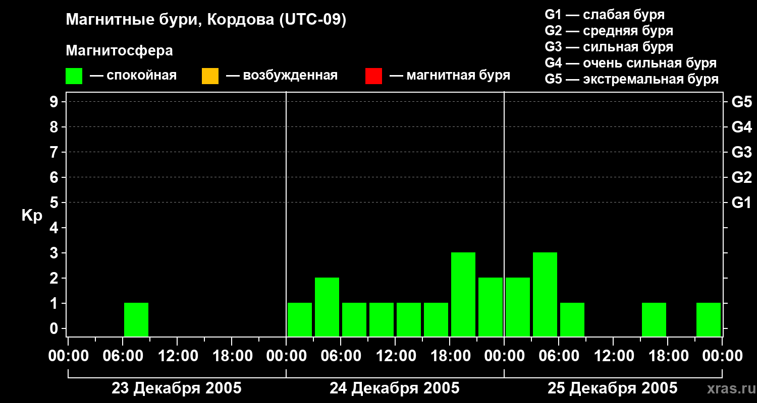 Изменения геомагнитного индекса Kp с 23 по 25 декабря 2005 года для средних широт