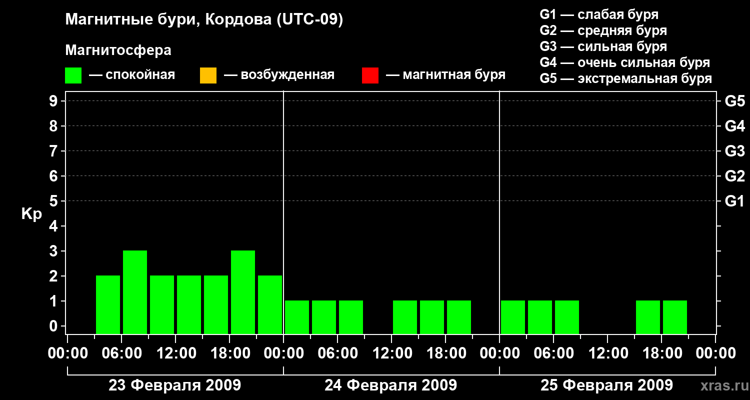 Изменения геомагнитного индекса Kp с 23 по 25 февраля 2009 года для средних широт
