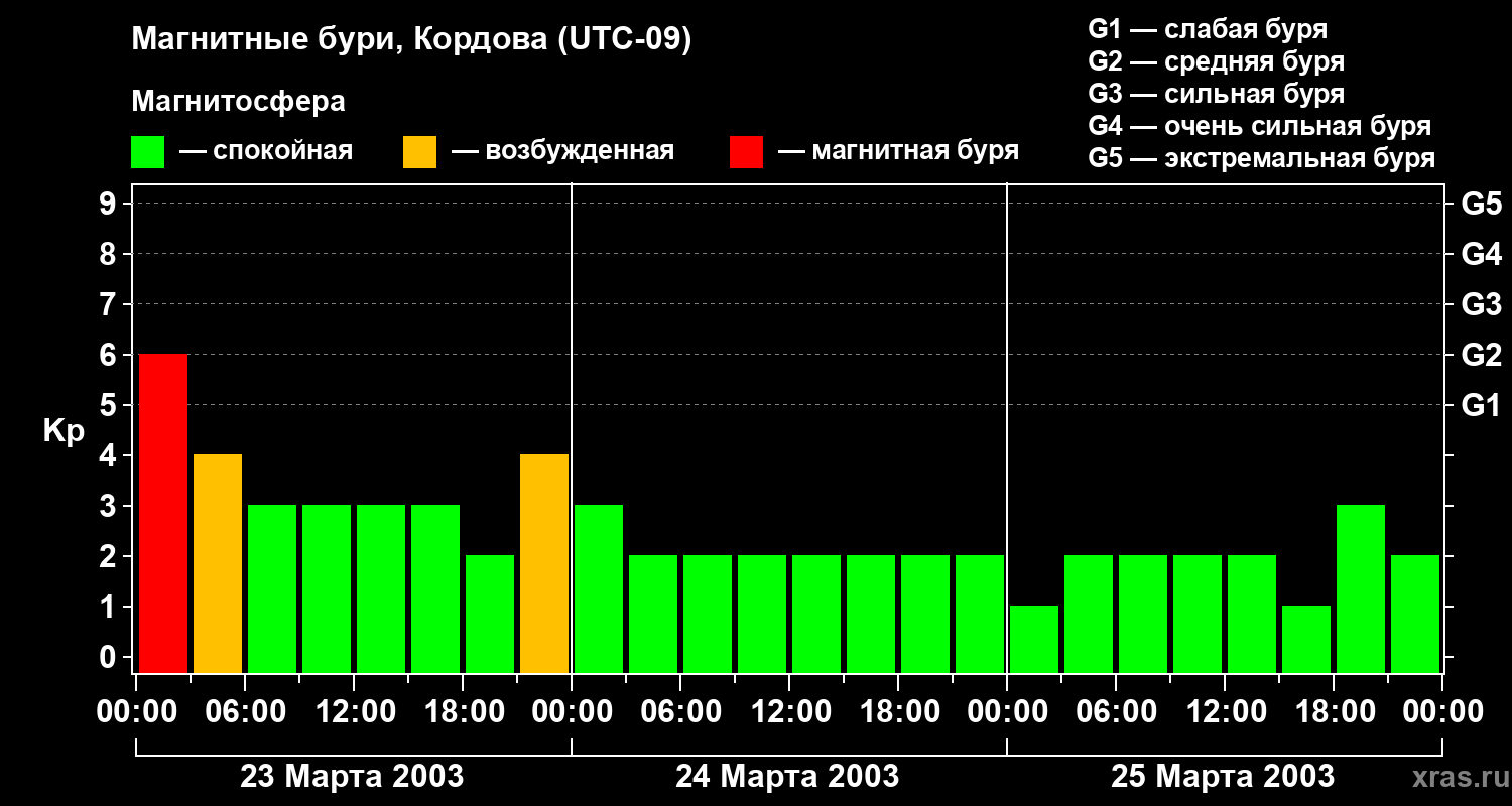 Изменения геомагнитного индекса Kp с 23 по 25 марта 2003 года для средних широт