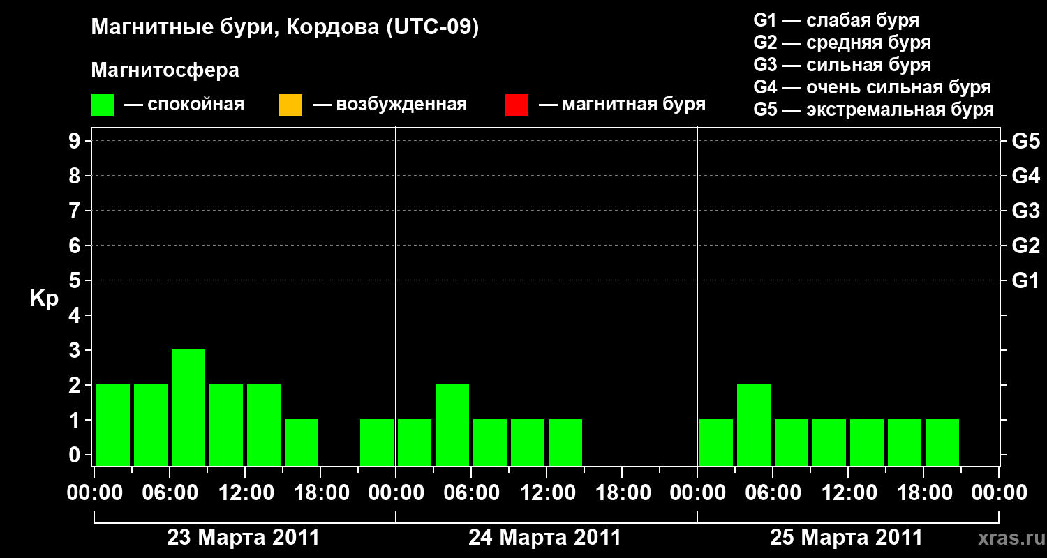 Изменения геомагнитного индекса Kp с 23 по 25 марта 2011 года для средних широт