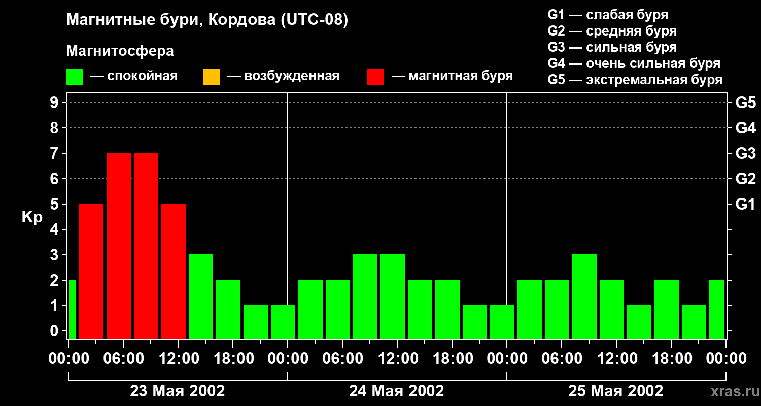 Изменения геомагнитного индекса Kp с 23 по 25 мая 2002 года для средних широт
