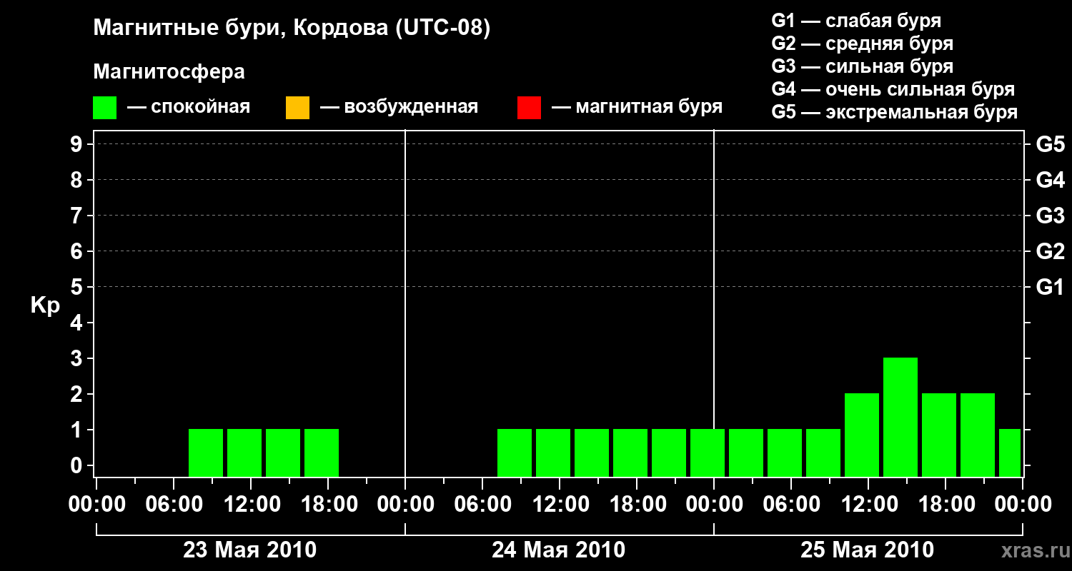 Изменения геомагнитного индекса Kp с 23 по 25 мая 2010 года для средних широт