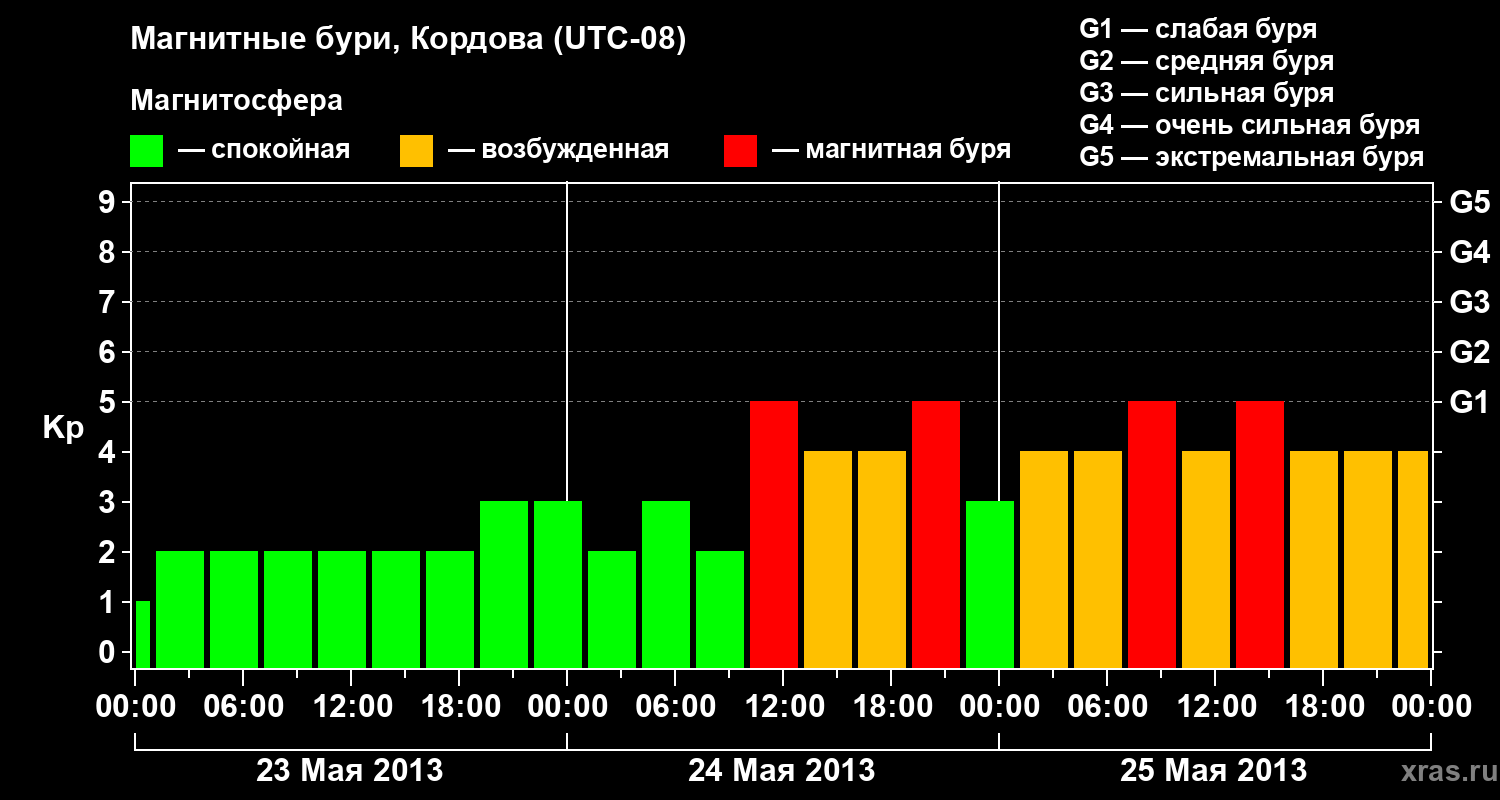 Изменения геомагнитного индекса Kp с 23 по 25 мая 2013 года для средних широт