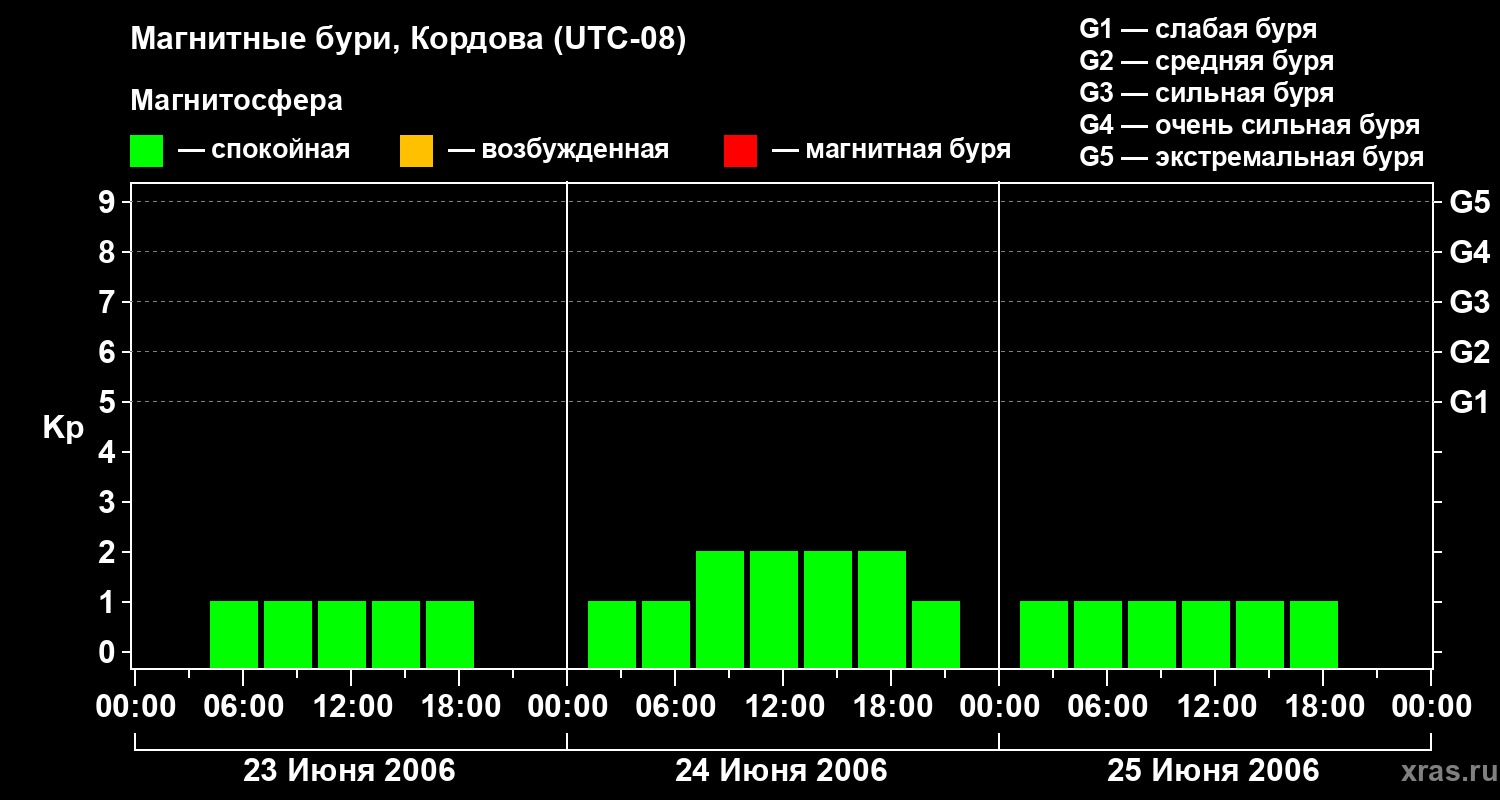 Изменения геомагнитного индекса Kp с 23 по 25 июня 2006 года для средних широт