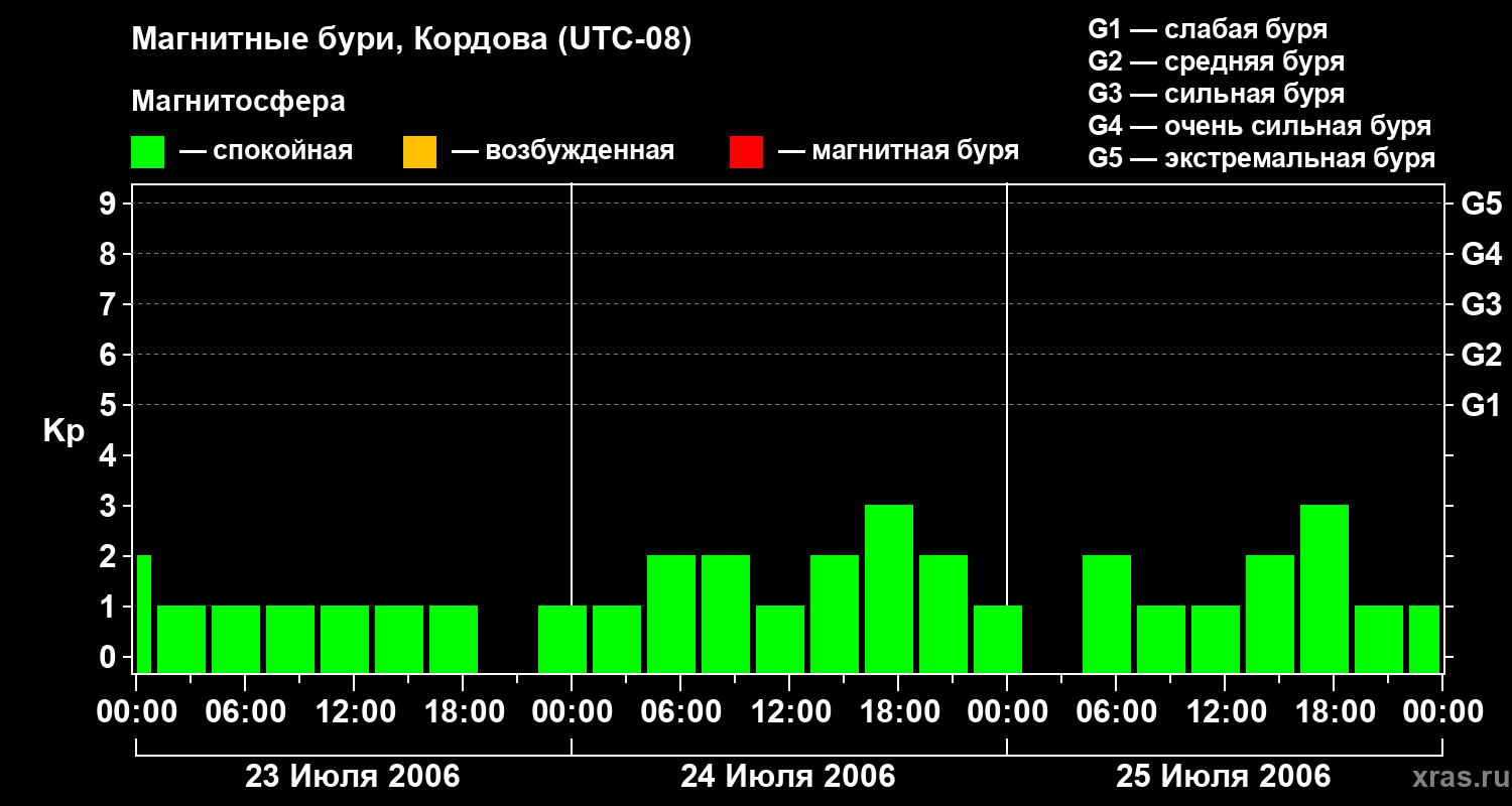 Изменения геомагнитного индекса Kp с 23 по 25 июля 2006 года для средних широт