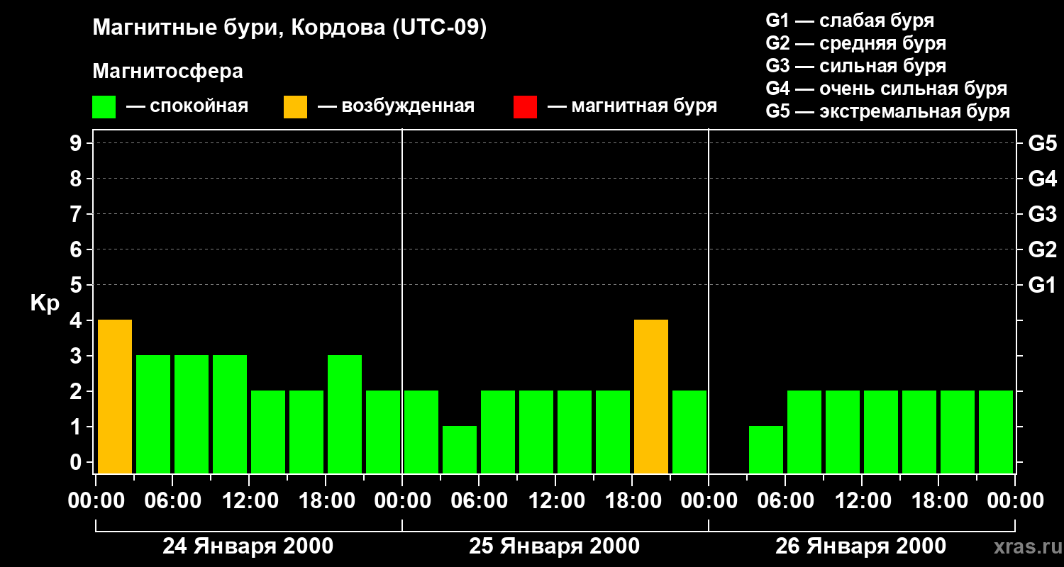 Изменения геомагнитного индекса Kp с 24 по 26 января 2000 года для средних широт