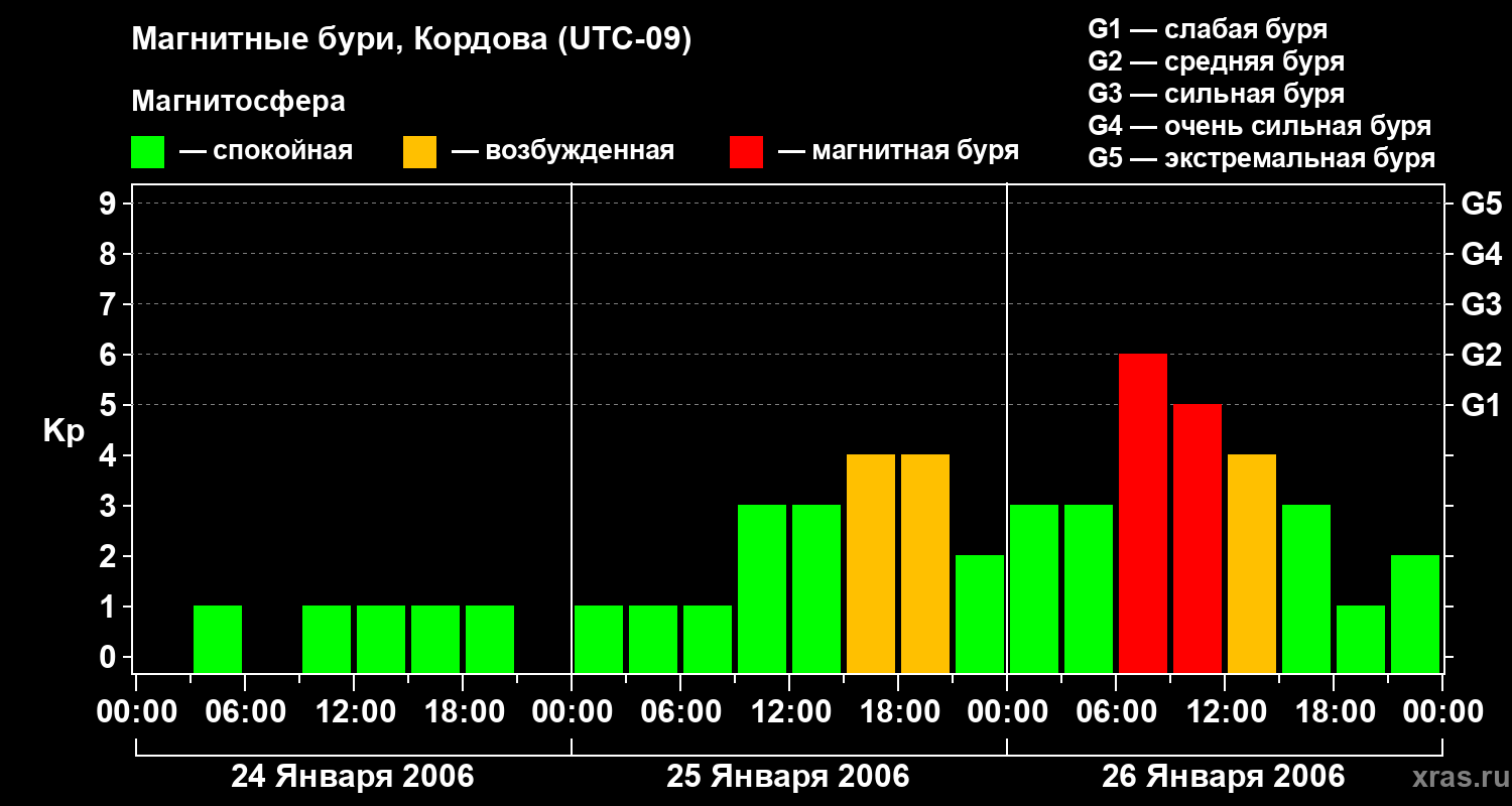 Изменения геомагнитного индекса Kp с 24 по 26 января 2006 года для средних широт