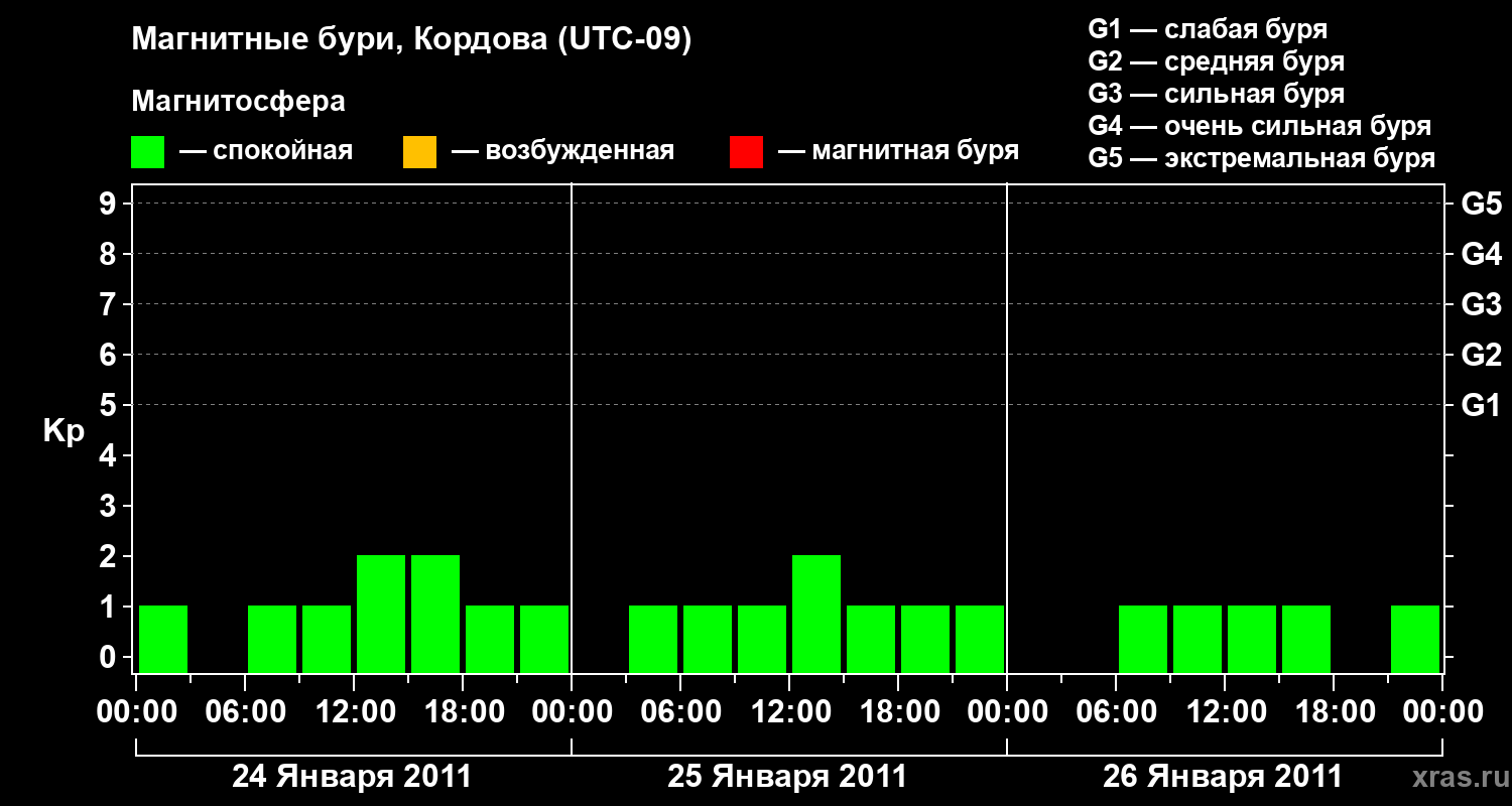 Изменения геомагнитного индекса Kp с 24 по 26 января 2011 года для средних широт