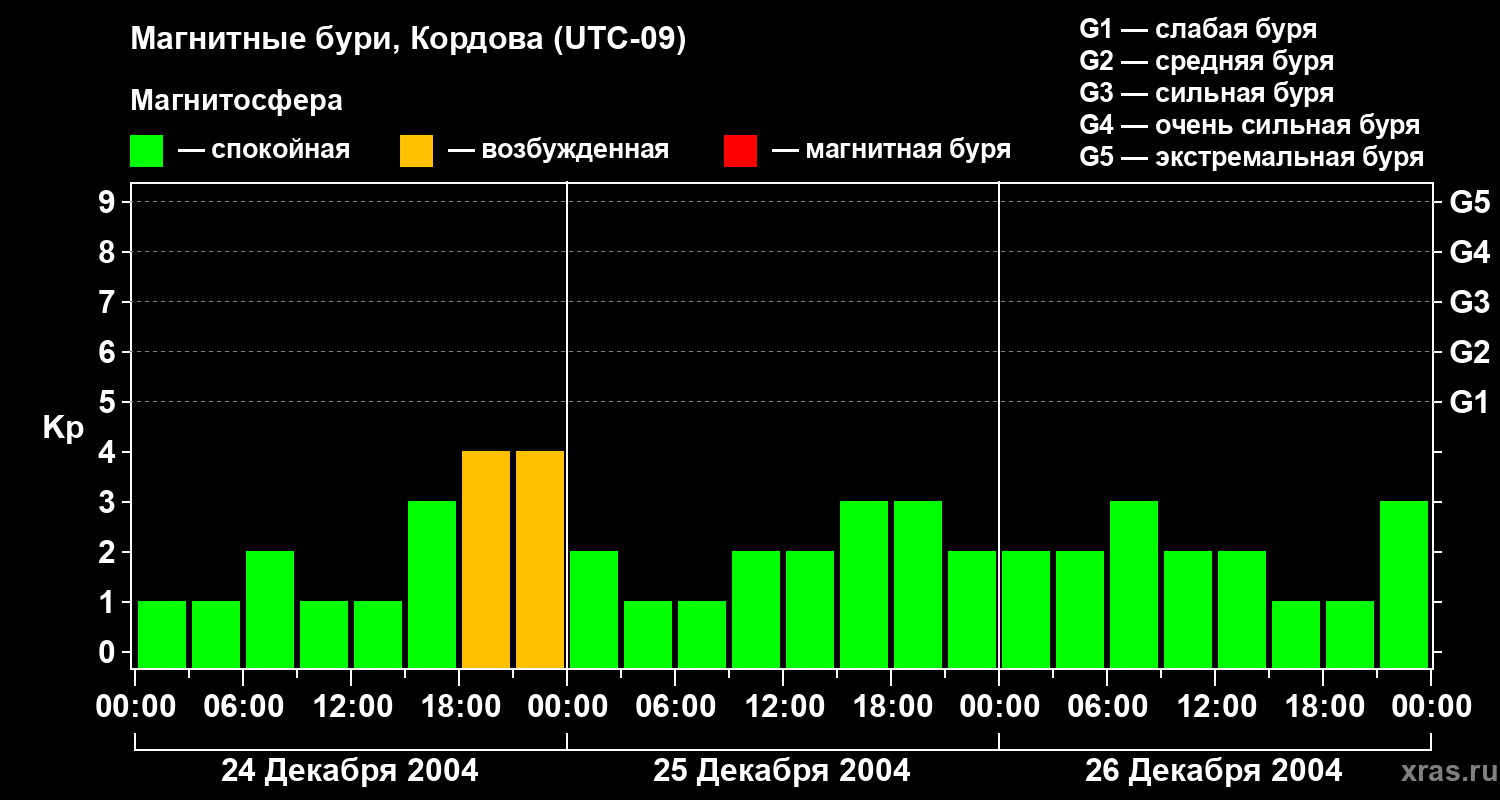 Изменения геомагнитного индекса Kp с 24 по 26 декабря 2004 года для средних широт