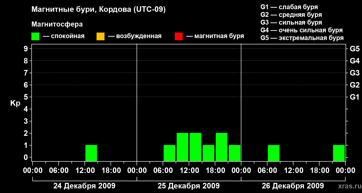Изменения геомагнитного индекса Kp с 24 по 26 декабря 2009 года для средних широт