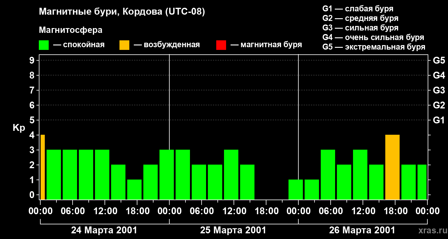 Изменения геомагнитного индекса Kp с 24 по 26 марта 2001 года для средних широт