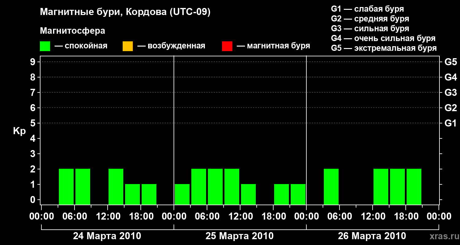 Изменения геомагнитного индекса Kp с 24 по 26 марта 2010 года для средних широт
