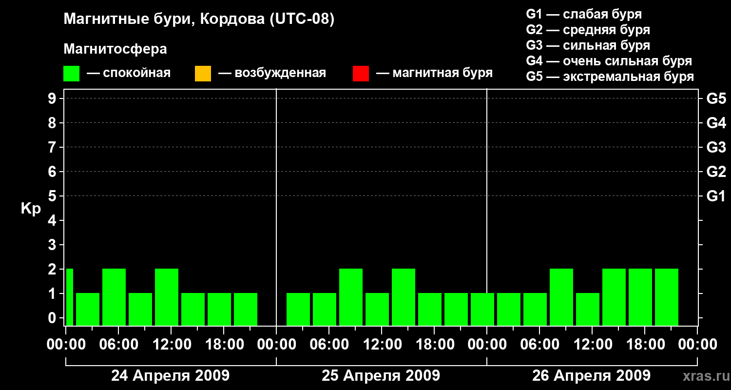 Изменения геомагнитного индекса Kp с 24 по 26 апреля 2009 года для средних широт
