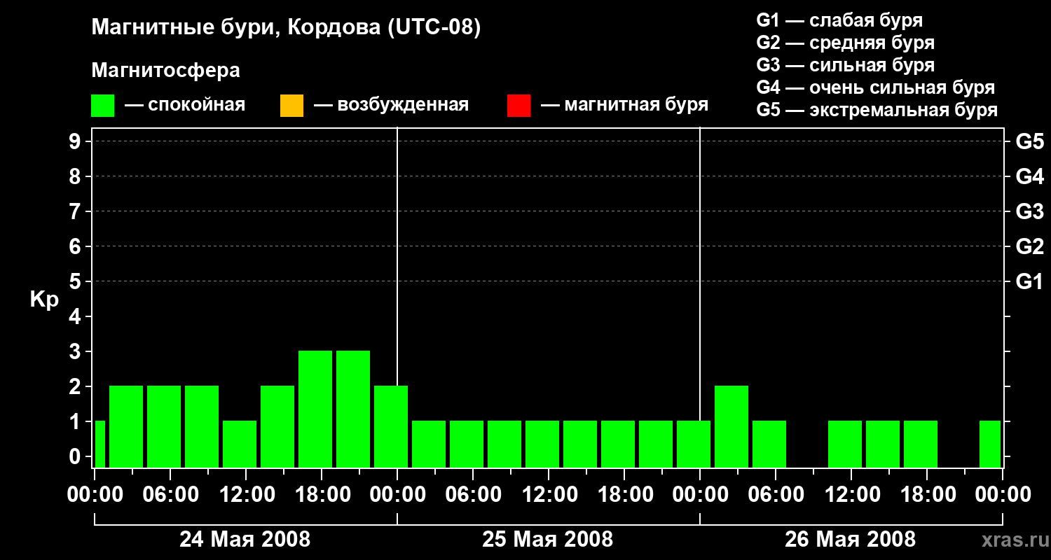 Изменения геомагнитного индекса Kp с 24 по 26 мая 2008 года для средних широт