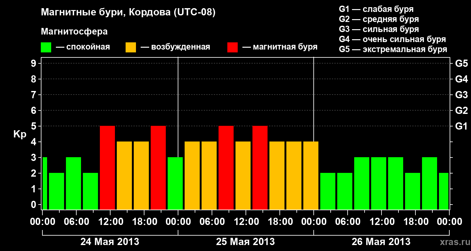 Изменения геомагнитного индекса Kp с 24 по 26 мая 2013 года для средних широт