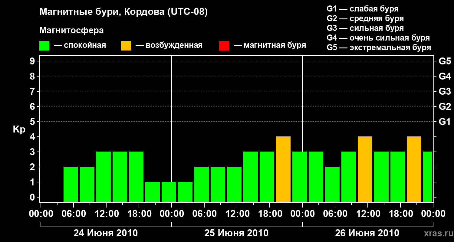 Изменения геомагнитного индекса Kp с 24 по 26 июня 2010 года для средних широт