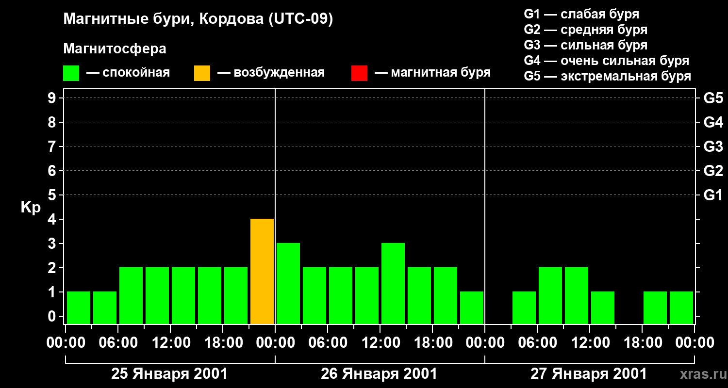 Изменения геомагнитного индекса Kp с 25 по 27 января 2001 года для средних широт