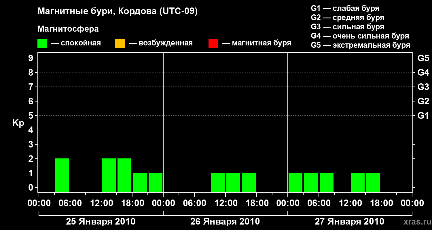 Изменения геомагнитного индекса Kp с 25 по 27 января 2010 года для средних широт