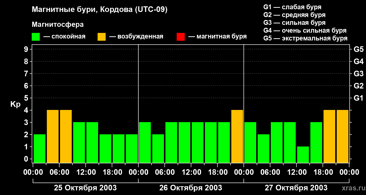 Изменения геомагнитного индекса Kp с 25 по 27 октября 2003 года для средних широт
