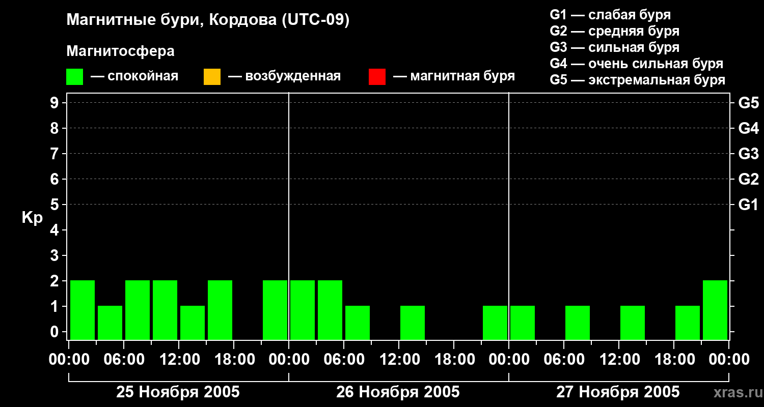 Изменения геомагнитного индекса Kp с 25 по 27 ноября 2005 года для средних широт