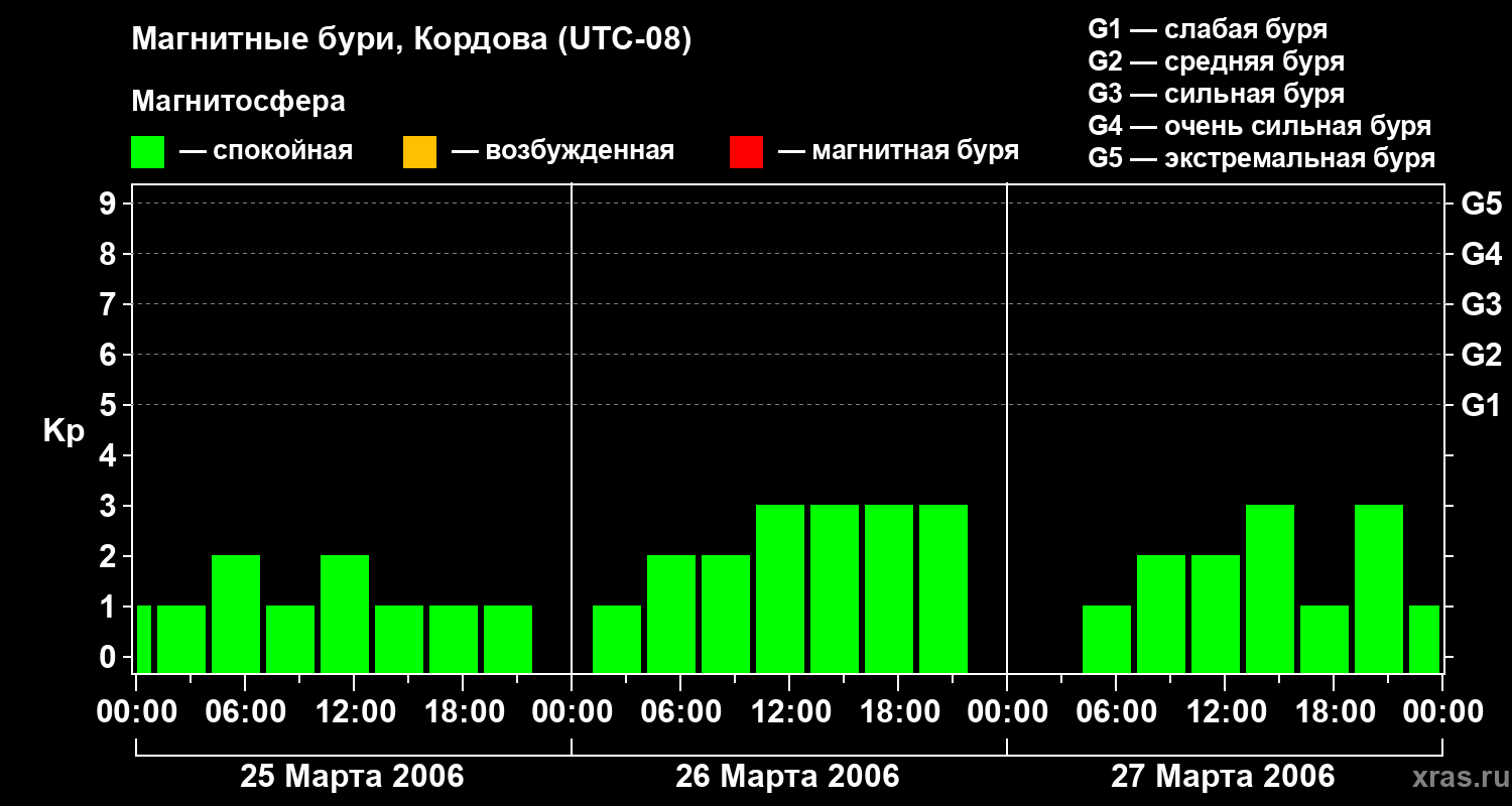 Изменения геомагнитного индекса Kp с 25 по 27 марта 2006 года для средних широт
