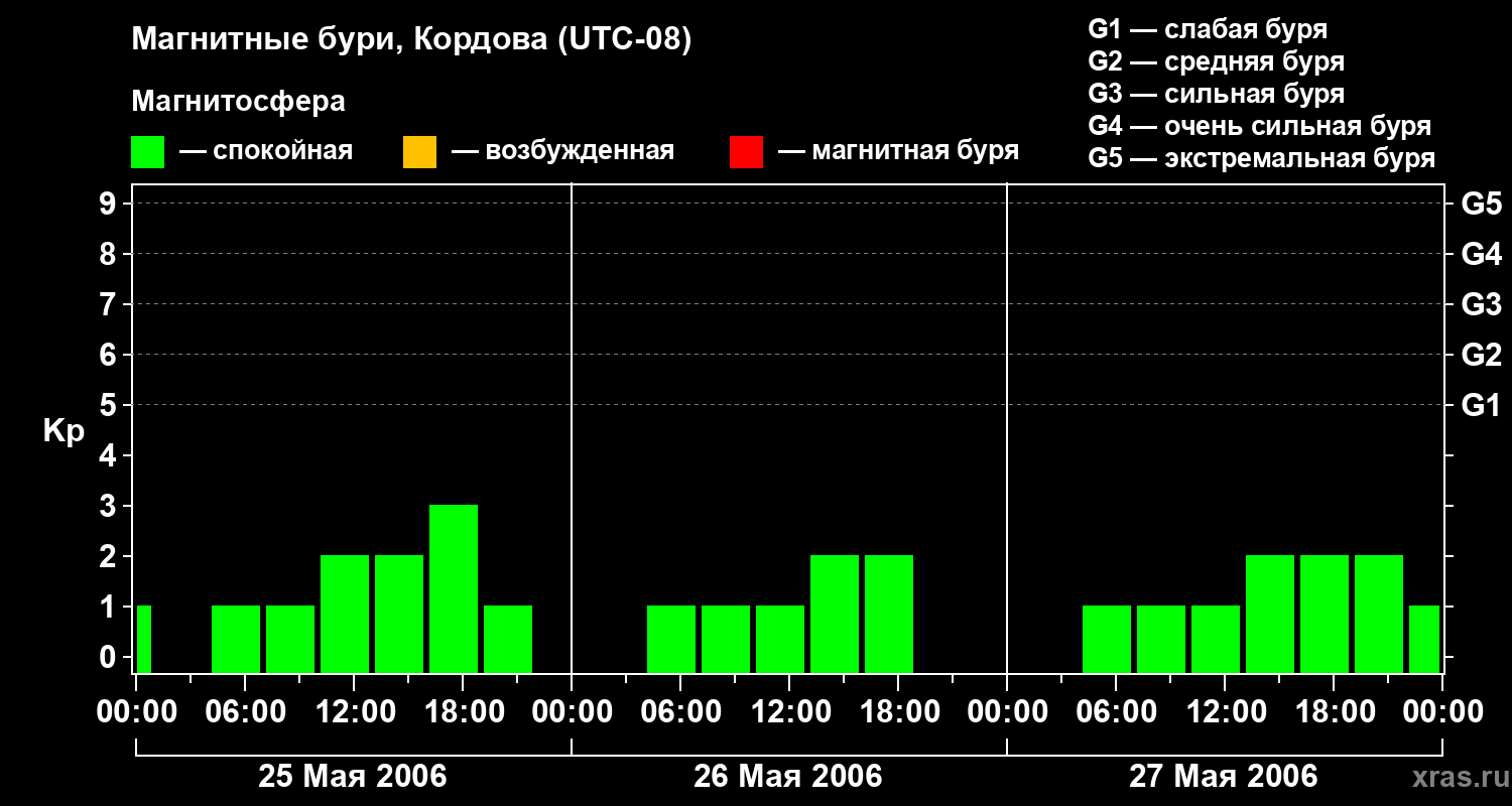 Изменения геомагнитного индекса Kp с 25 по 27 мая 2006 года для средних широт