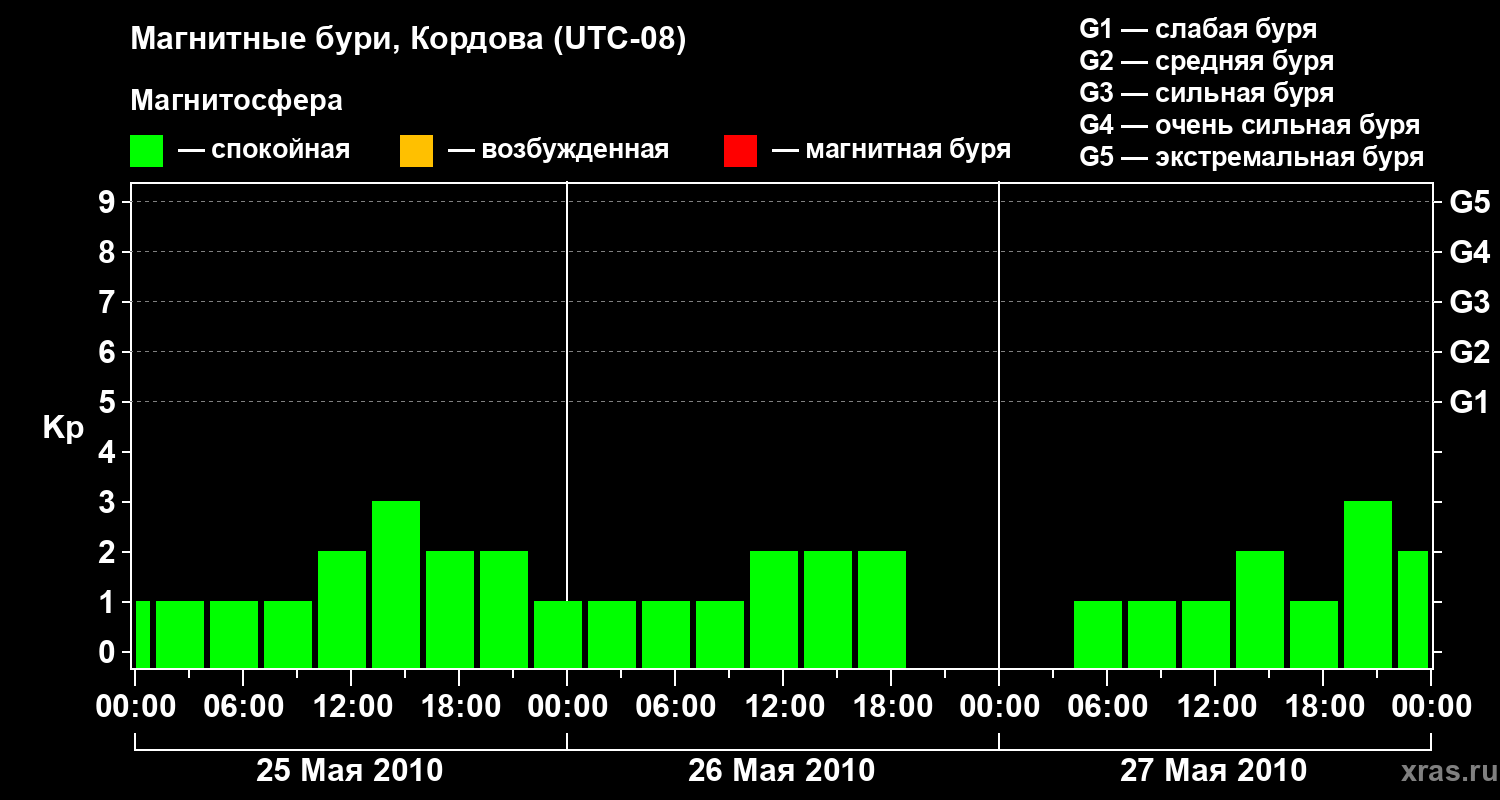 Изменения геомагнитного индекса Kp с 25 по 27 мая 2010 года для средних широт