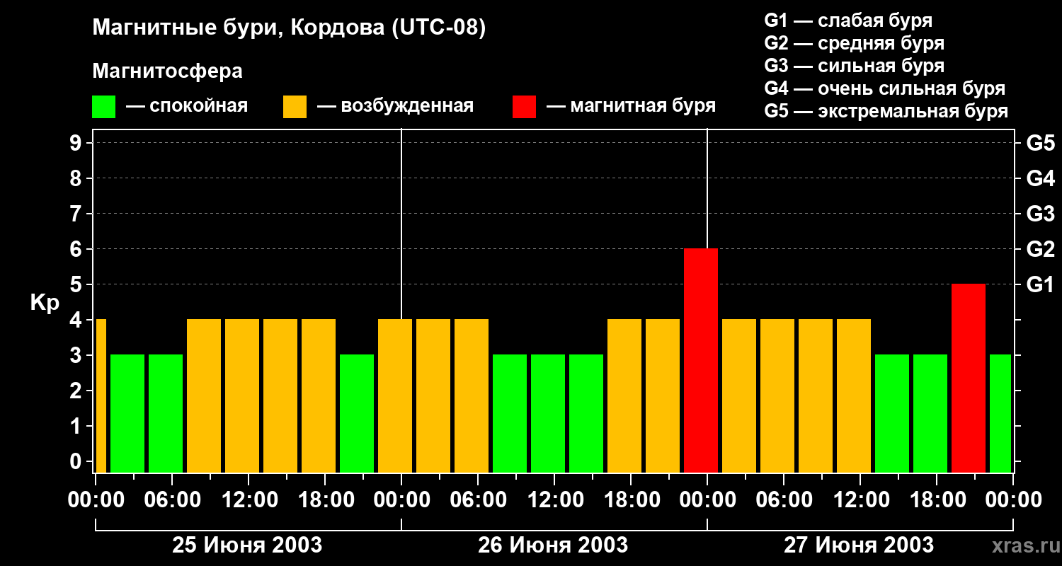 Изменения геомагнитного индекса Kp с 25 по 27 июня 2003 года для средних широт