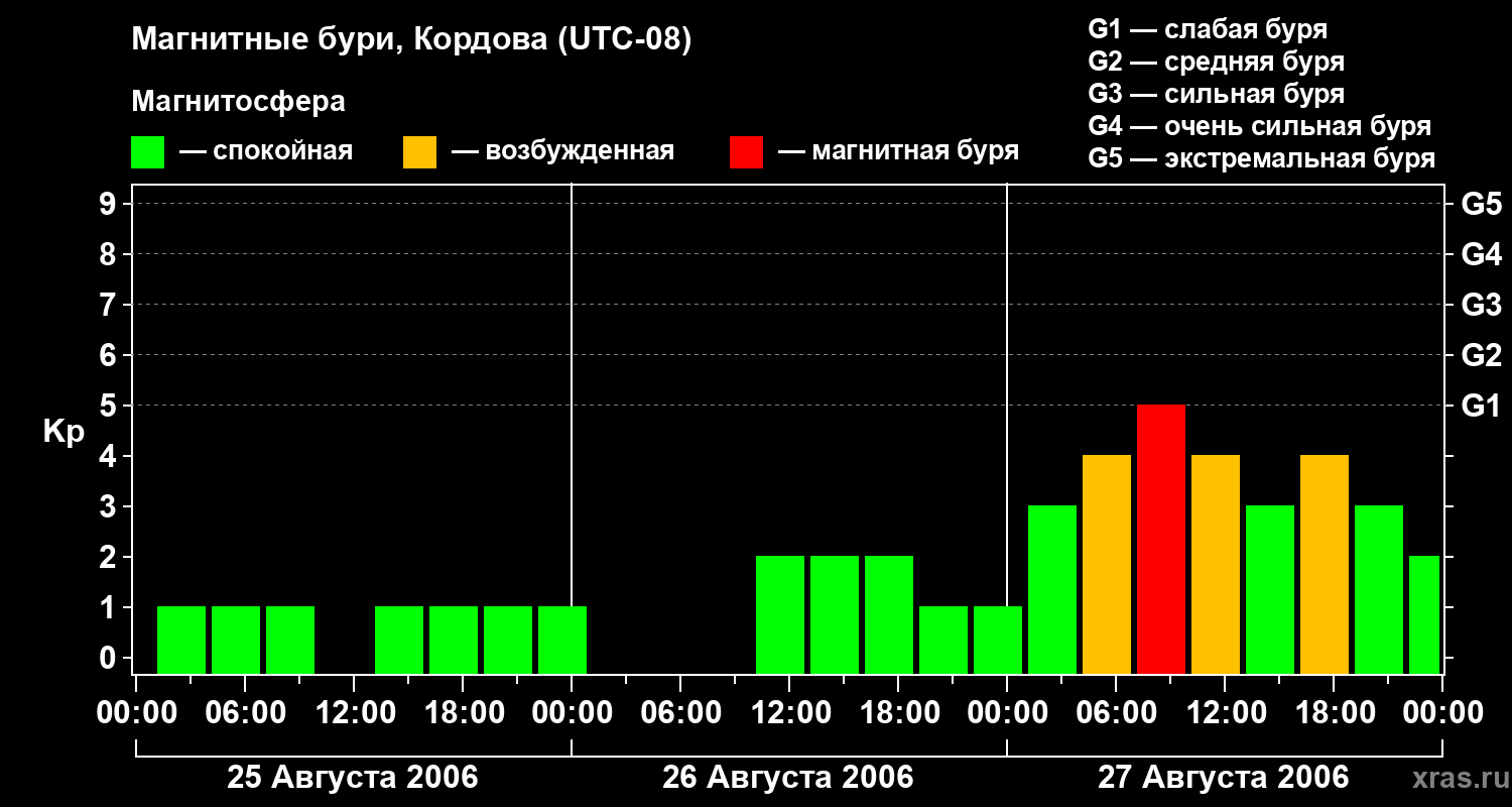Изменения геомагнитного индекса Kp с 25 по 27 августа 2006 года для средних широт