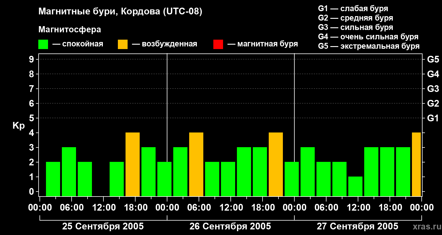 Изменения геомагнитного индекса Kp с 25 по 27 сентября 2005 года для средних широт