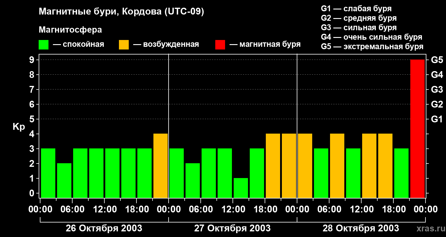 Изменения геомагнитного индекса Kp с 26 по 28 октября 2003 года для средних широт