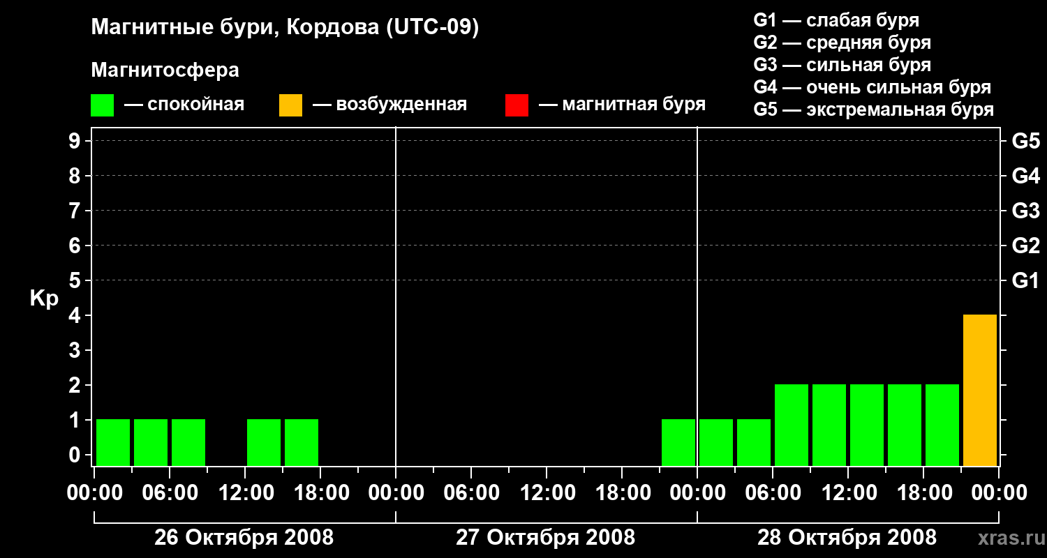 Изменения геомагнитного индекса Kp с 26 по 28 октября 2008 года для средних широт