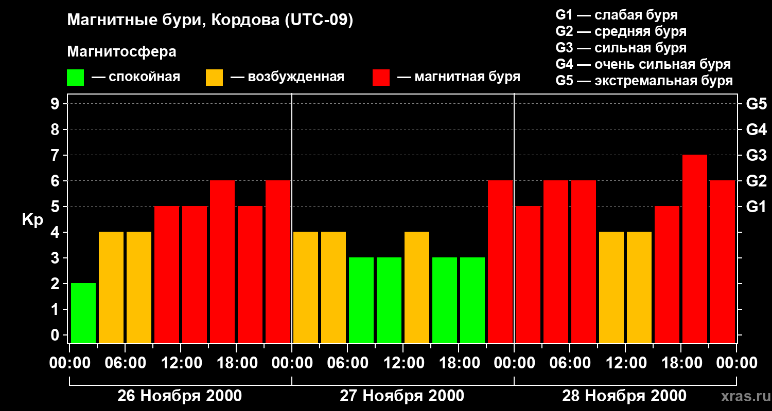 Изменения геомагнитного индекса Kp с 26 по 28 ноября 2000 года для средних широт